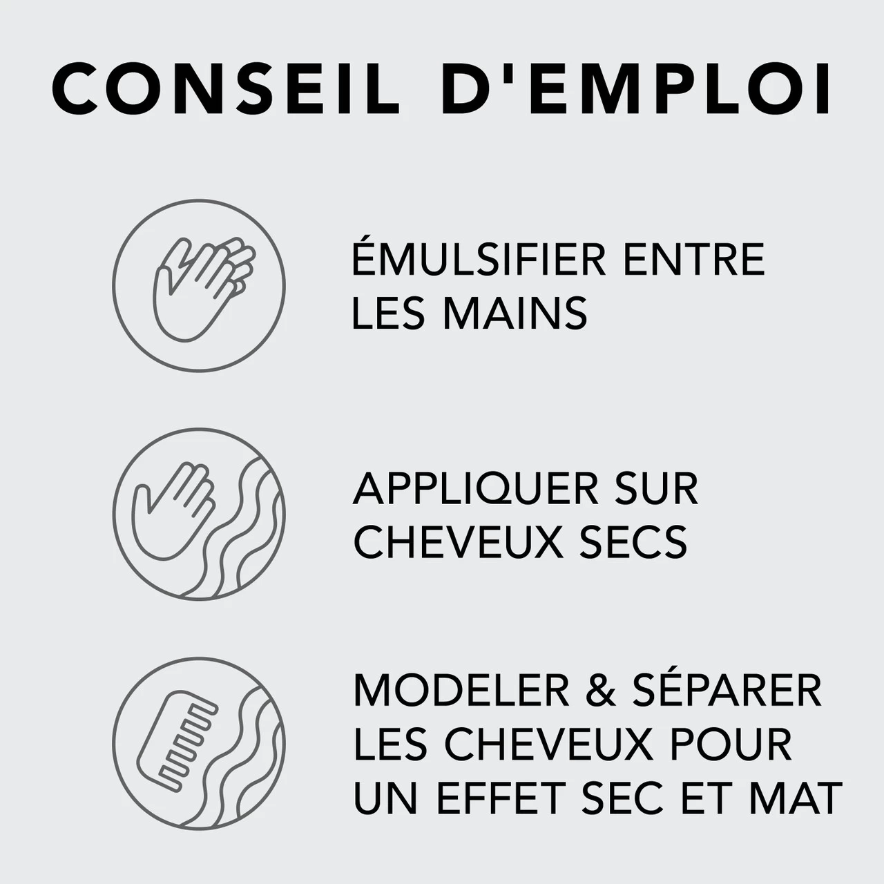 – Travaillez sur cheveux secs pour changer de texture, modeler et séparer (avec un fini mat)